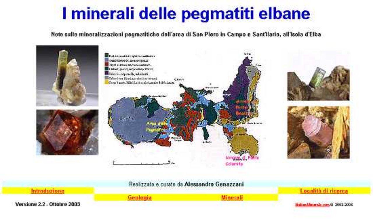 Cliccando sui titoli si entra nelle varie pagine percorrendo l'itinerario che più ci piace per consultare la geologia dell'Isola d'Elba, i minerali, le località di ricerca relative a I minerali delle pegmatiti elbane.