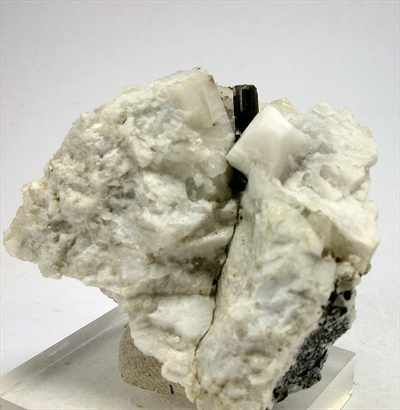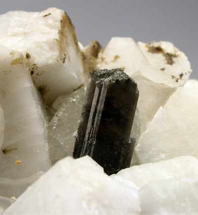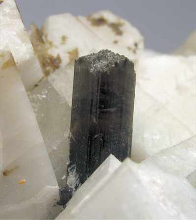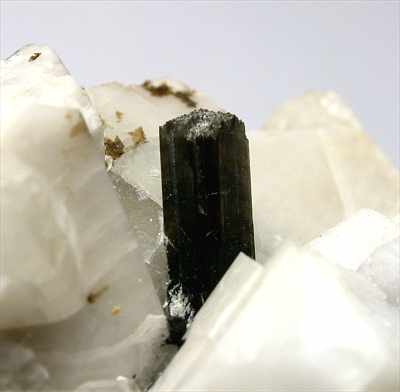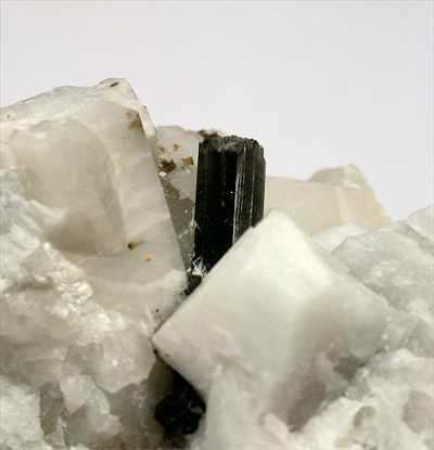 SAN PIERO, ISOLA ELBA, ITALY - Nicely terminated elbaite of 1.3 cm is located among feldspar crystals ! The elbaites is perfectly terminated and though dark in color, it shows a deep brown color ! Great contrast on the matrix ! Overall size is 4x4x3.5 cm.