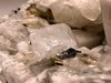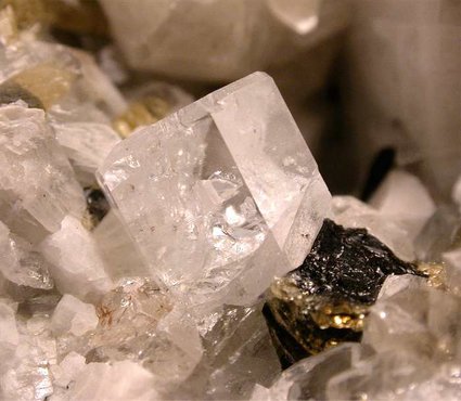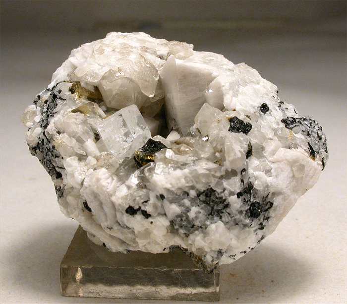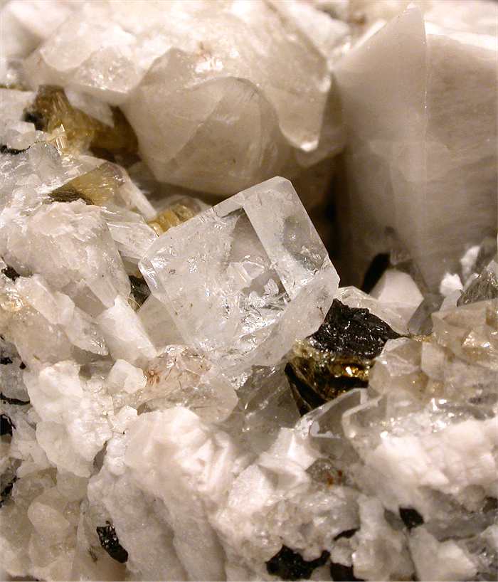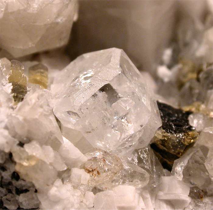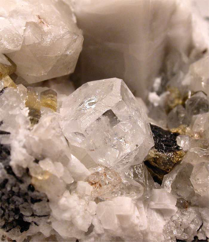 San Piero, Isola Elba, Livorno, Italy - Super bright, gemmy beryl shows on this specimen ! The beryl is 0.9x0.8x0.7 cm in size and is perfectly located close to quartz and orthoclase crystals. Close to the beryl there are a number of yellow/green elbaites of 0.5 cm in size. Overall size is 5x3.5x2.5 cm.
