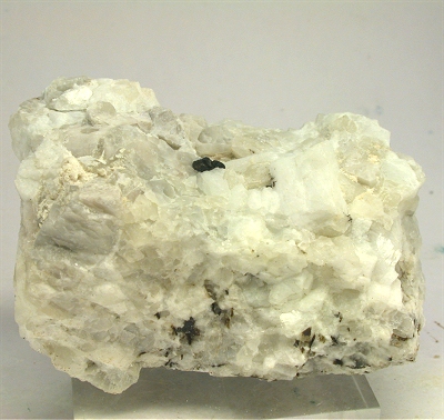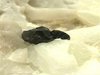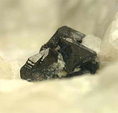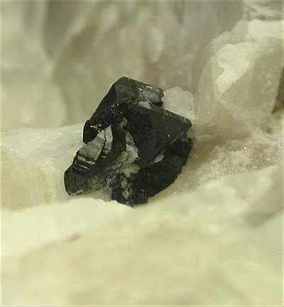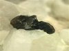 SAN PIERO, ISOLA ELBA, ITALY - On the white pegmatite of this rock there are 2 cassiterite crystals, nicely located in the middle of a cavity. The crystals are well exposed and up to 2-3 mm in size, forming a group of 0.5 cm. An uncommon mineral from Elba pegmatite. Overall size is 5x3x3 cm