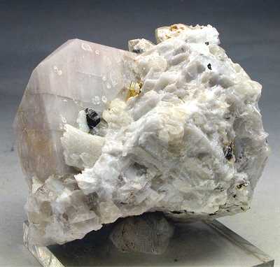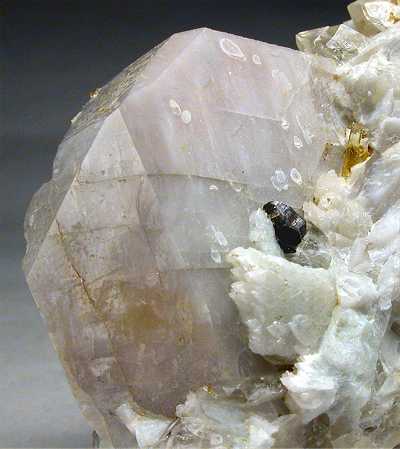San Piero, Isola Elba, Livorno, Italy - Incredibly large ! Close to a large pink feldspar thre is a terminated cassiterite crystal of 0.4 cm in size ! Quite large for the species from this locality ! The orthoclase is 2.5 cm on the edge ! Overall size is 4.5x4x3 cm