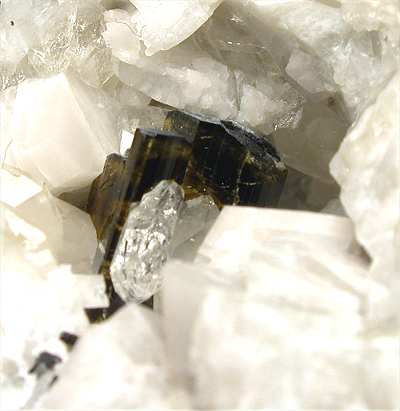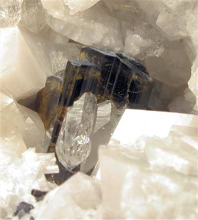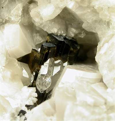SAN PIERO, ISOLA ELBA, LIVORNO, ITALY - In this open cavity there are half a dozen elbaite crystals, all terminated ! The crystals are nested among quartz and feldspar crystals. Their size is up to 0.8 cm. Nice rock of 8x4.5x4 cm