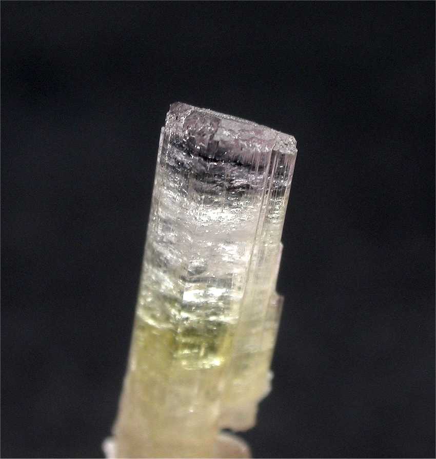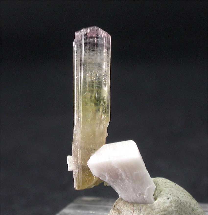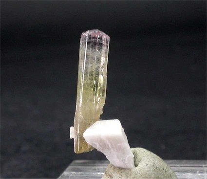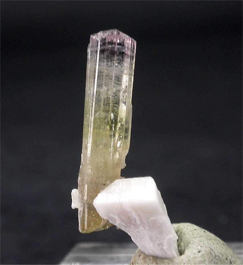 San Piero, Isola Elba, Livorno, Italy - Greatly terminated elbaite crystal nicely located on orthoclase small piece of matrix. The crystal shows greatly with nice change of color close to the top where it is with a light violet. The crystal is 1.7 cm in size !