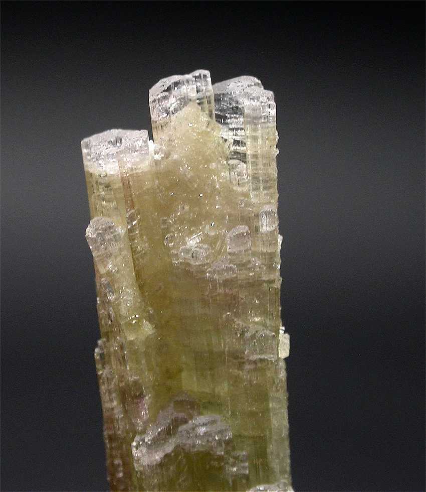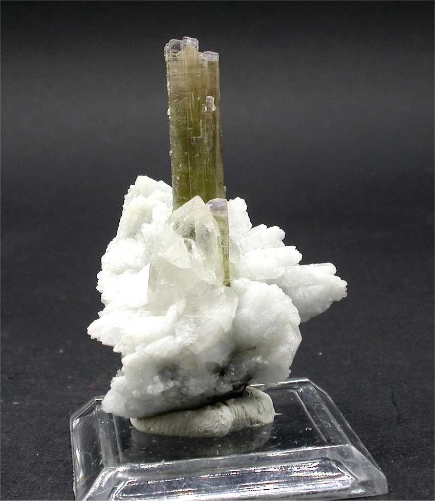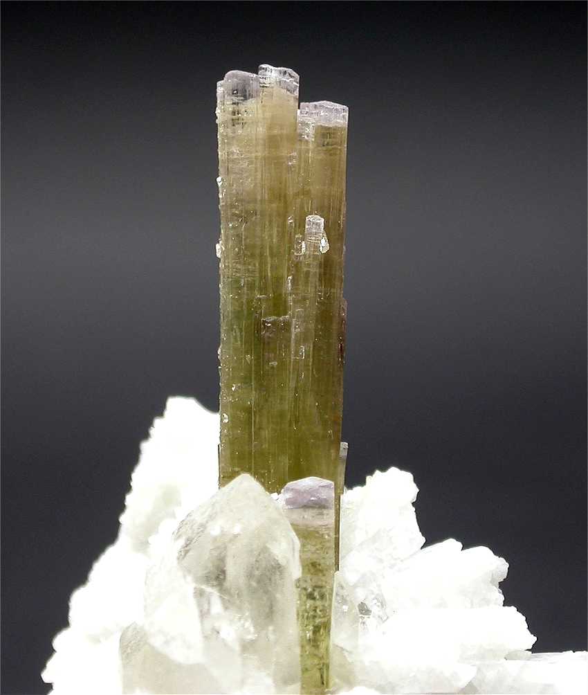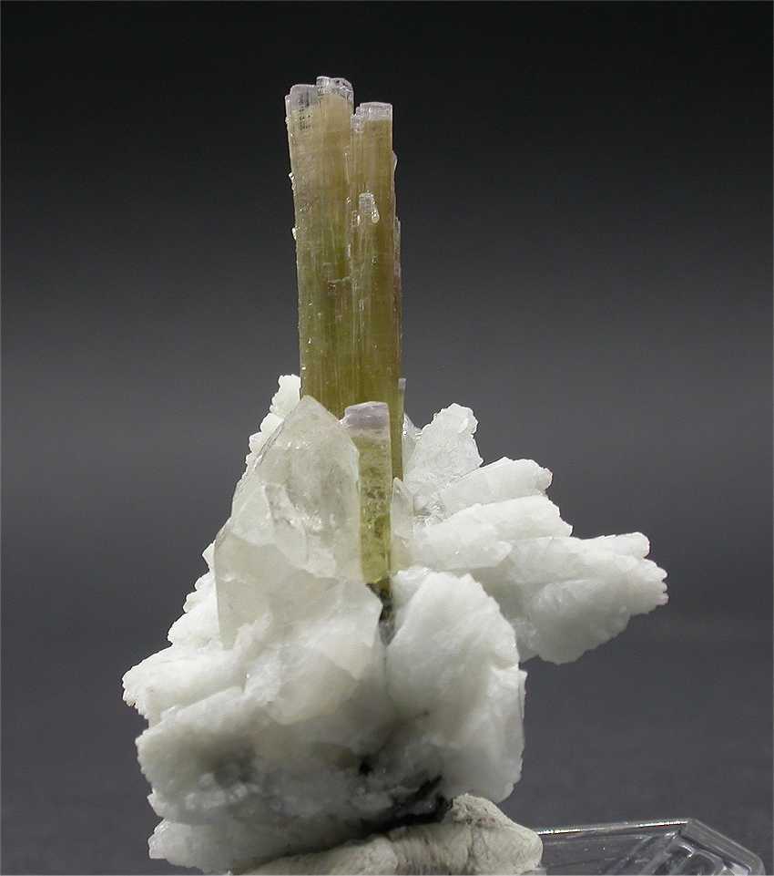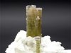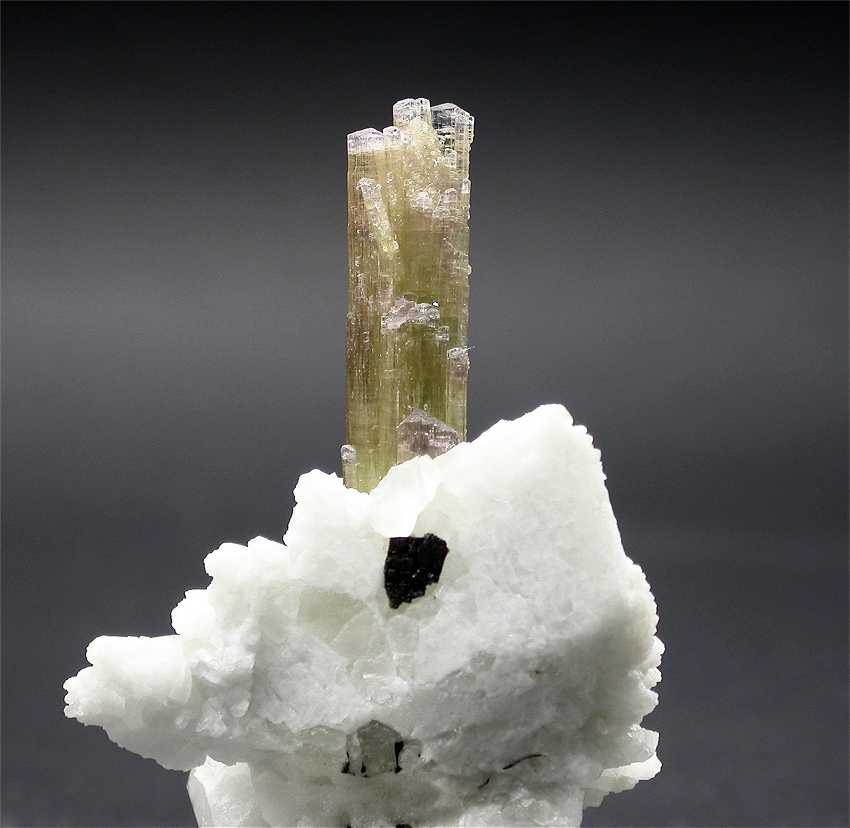 San Piero, Isola Elba, Livorno, Italy - Very esthetic elbaite crystals from this classic italian location. On a small piece of pegmatite matrix a terminated elbaite emerges from a group of albite and quartz crystals. The crystal is 3 cm in size and has a small elbaite at its side of 1.5 cm ! nice light green color that changes to almost pink close to the top. Very nice specimen from Isola Elba ! overall size is5.5x3.5x3 cm.