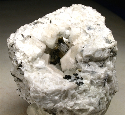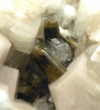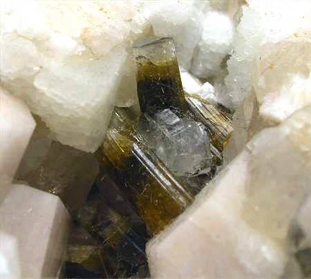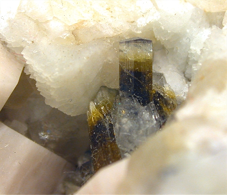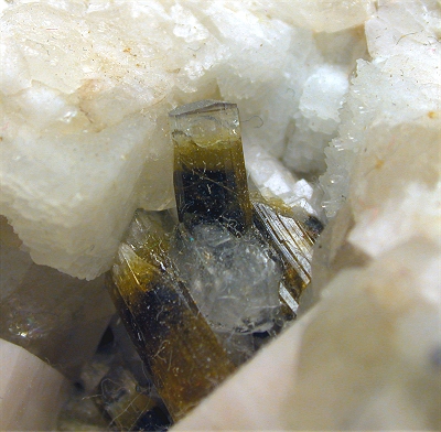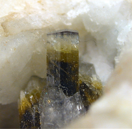 San Piero, Isola Elba, Livorno, Italy - It happens to find nice elbaites hidden inside some cavities. This is one ! There are 5 multicolor elbaites all together in this cavity. The most evident is the one grown on a quartz crystal ! This elbaite is 0.5 cm in size and has close to it an other that is 0.8 cm ! some light pink feldspar complete the picture of the cavity. Nice specimen of 6.5x6x3.8 cm