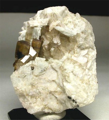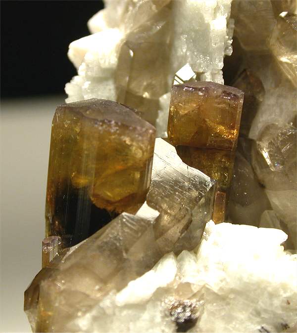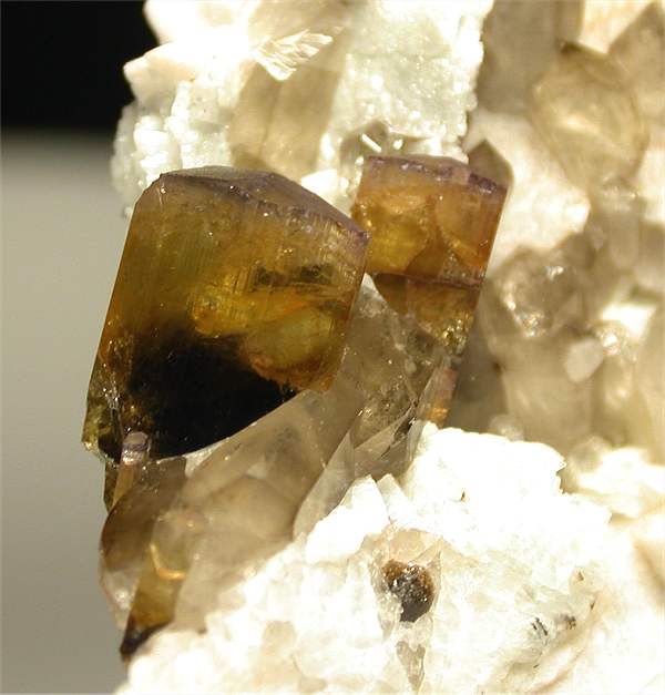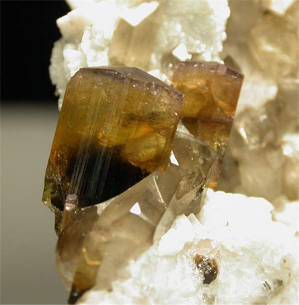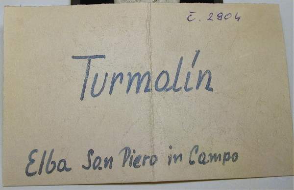 San Piero, Isola Elba, Livorno, Italy - An old specimen, collected at the beginning of 1900, probably from Grotta d'Oggi area. It hosts 2 perfectly terminated and undamaged polichrome elbaites of 1 and 1.7 cm in size !There are various quartz crystals and one is located in between the 2 elbaites. On the back there are the various collection numbers. It comes with the old label (german collection). Overall size is 6.5x5.5x3 cm