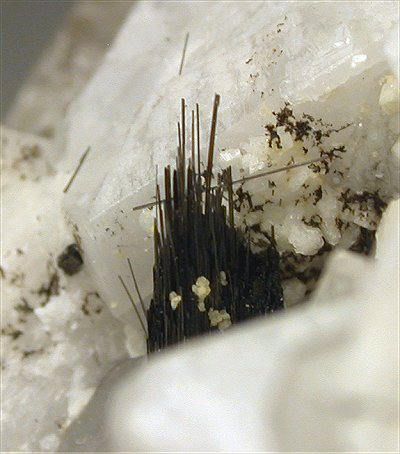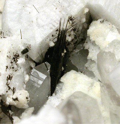 SANT ILARIO, ISOLA ELBA, ITALY - This specimen is from an exhausted pegmatite vein known as Pastori pocket. Worked in 2004, it produced several nice specimens of elbaite and foitite. This specimen hosts several bright white feldspar crystals up to 1-1.5 cm on the edge and a nice amount of 2-4 mm albite crystals. Inside an open cavity an undamaged cemtimentric elbaite emerges with a consistent amount of foitet on its top ! overall size of this specimen is 11x6.5x5 cm.