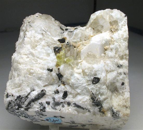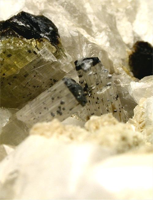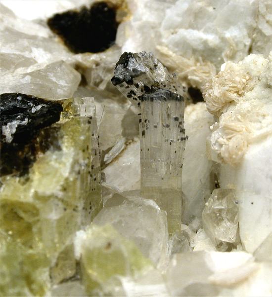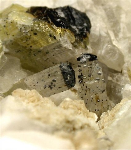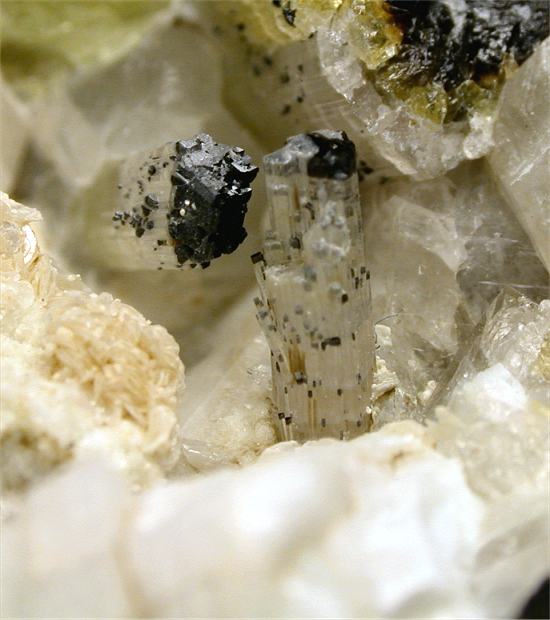 San Piero, Isola Elba, Livorno, Italy - Among the most rare tourmalines found in the pockets of the pegmatites of Isola Elba there is moor's head elbaites. We had been lucky this time and we got 2 perfectly terminated acroites with such Moor's head ! very nice terminated crystals of 1 cm in size nicely located in an open cavity close to a white feldspar crystal of 2 cm in size. Nice rock of 7x7x4 cm in size