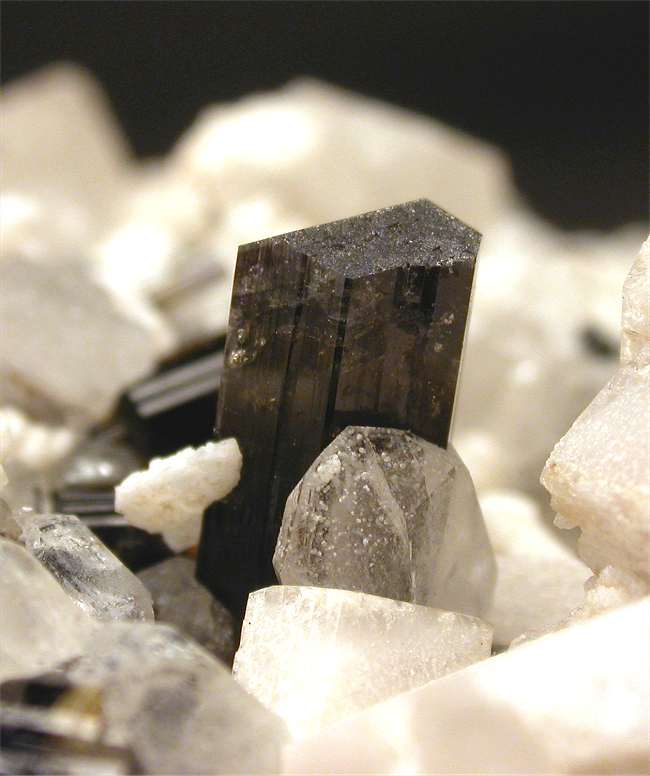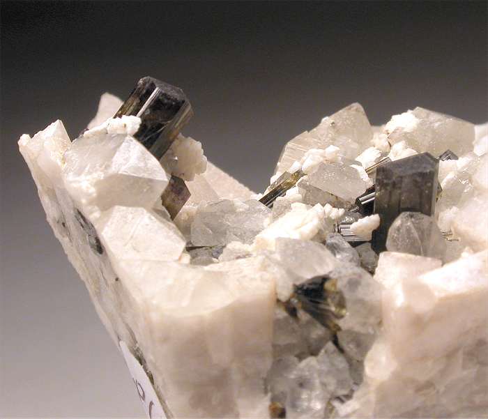 San Piero, Isola Elba, Livorno, Italy - A super specimen with a number of colored elbaites and feldspars ! There are a dozen elbaites nicely located on and among the feldspars. The elbaites show a nice brown color and are up to 0.8 cm in size ! A super showy rock of 5x4.5x4.5 cm