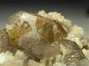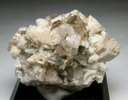 Grotta d'Oggi, San Piero, Isola Elba, Livorno, Italy - An old specimen from a german collection. This specimen is characterized by a biterminated quartz crystal of 2 cm in length with a lot of albite cluster all around it and among them there are a couple of perfectly terminated multicolor elbaites up to 0.6 cm in size. There are also some brown millimetric microlites, beryls dispersed among the albites and the books of cleavelandite. Very nice old timer of 5x4x2.5 cm.