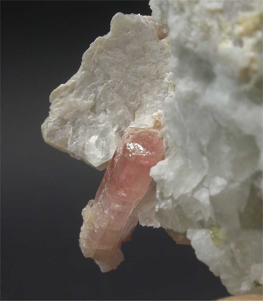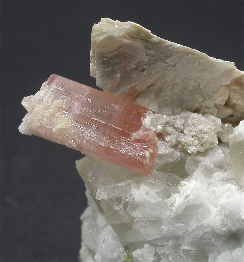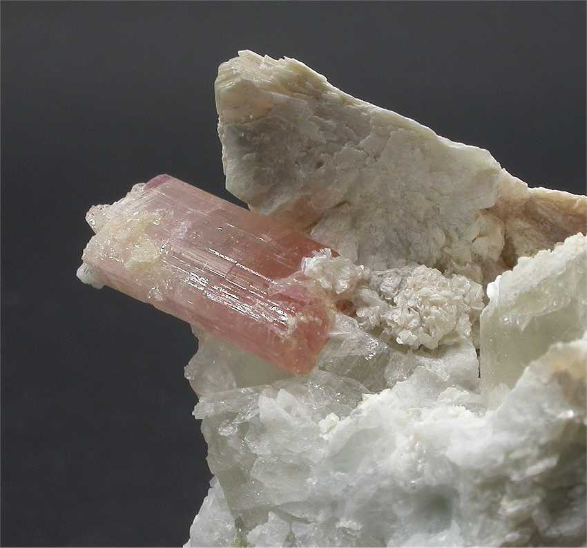 San Piero, Isola Elba, Livorno, Italy - Elbaite var rubellite are not a so common finding. Here we have a nice biterminated elbaite var rubellite of 1.5x0.8 cm in size located on a side of an open cavity with some cleavelandite and albite. Nice rock of 6.5x4x4 cm in size. Weight is 125 gr