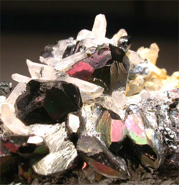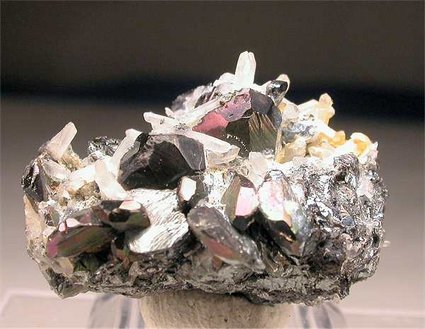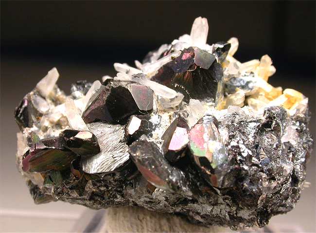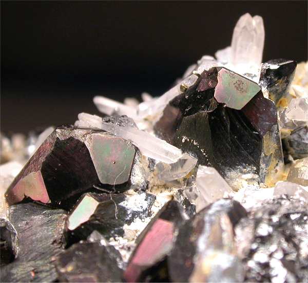 Bacino mine, Rio Marina, Isola Elba, Livorno, Italy - Nice bright and iridescent hematite crystals to 0.8-1 cm in size show among quartz crystals on an hematite matrix. A classic from Isola Elba iron mines ! Showy specimen of 3.5x2x2 cm