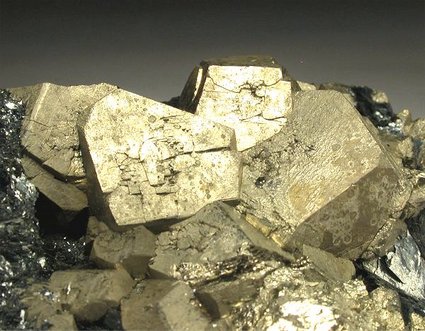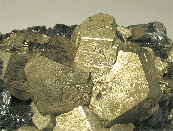 Valle Giove mine, Rio Marina, Isola Elba, Livorno, Italy - Large specimen with several bright pyrite pentagonododechahedrons. The crystals are all on hematite crystalline matrix and are up to 2 cm wide ! Some contact on the back of the specimen and minor damages on a small crystal in the front. A nice speciman from a classic locality, nice 10x5.5x3.5 cm
