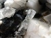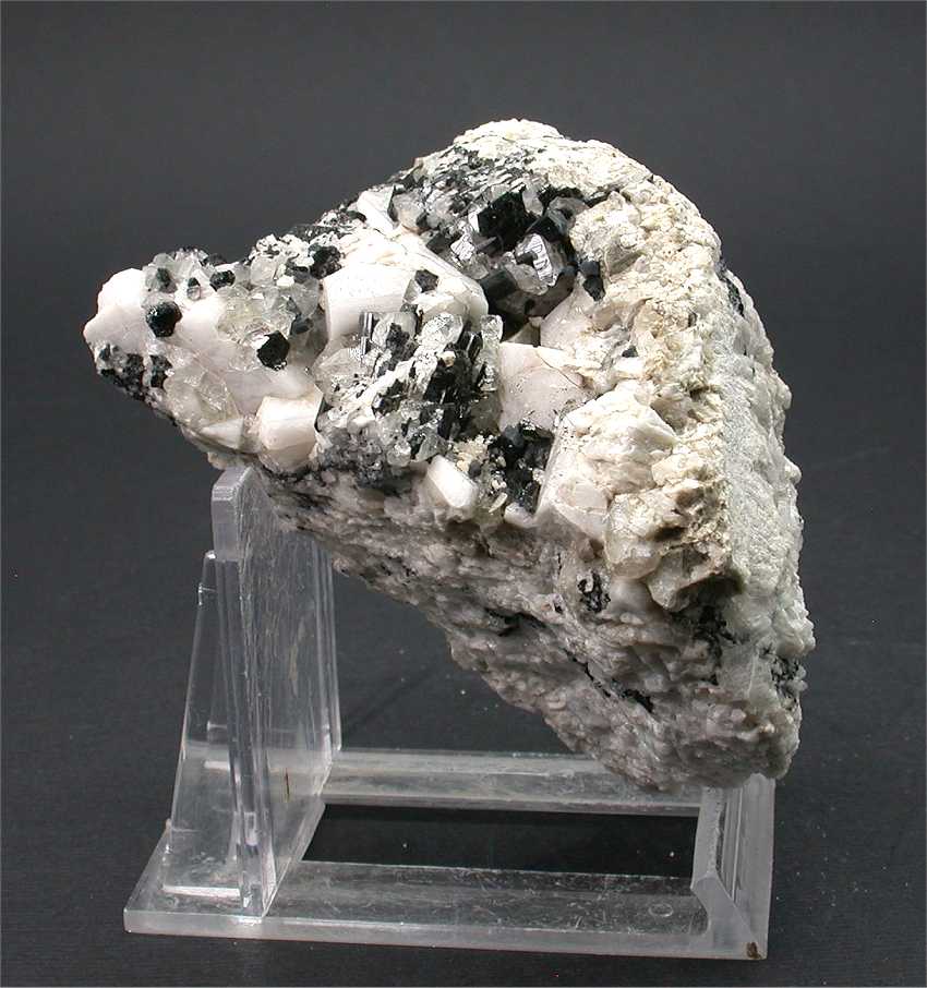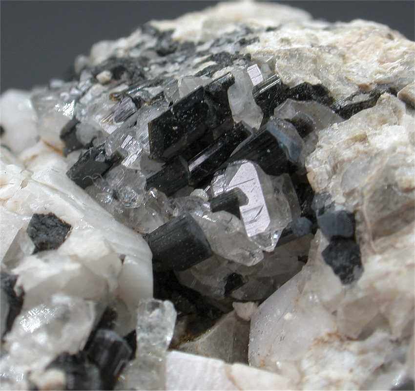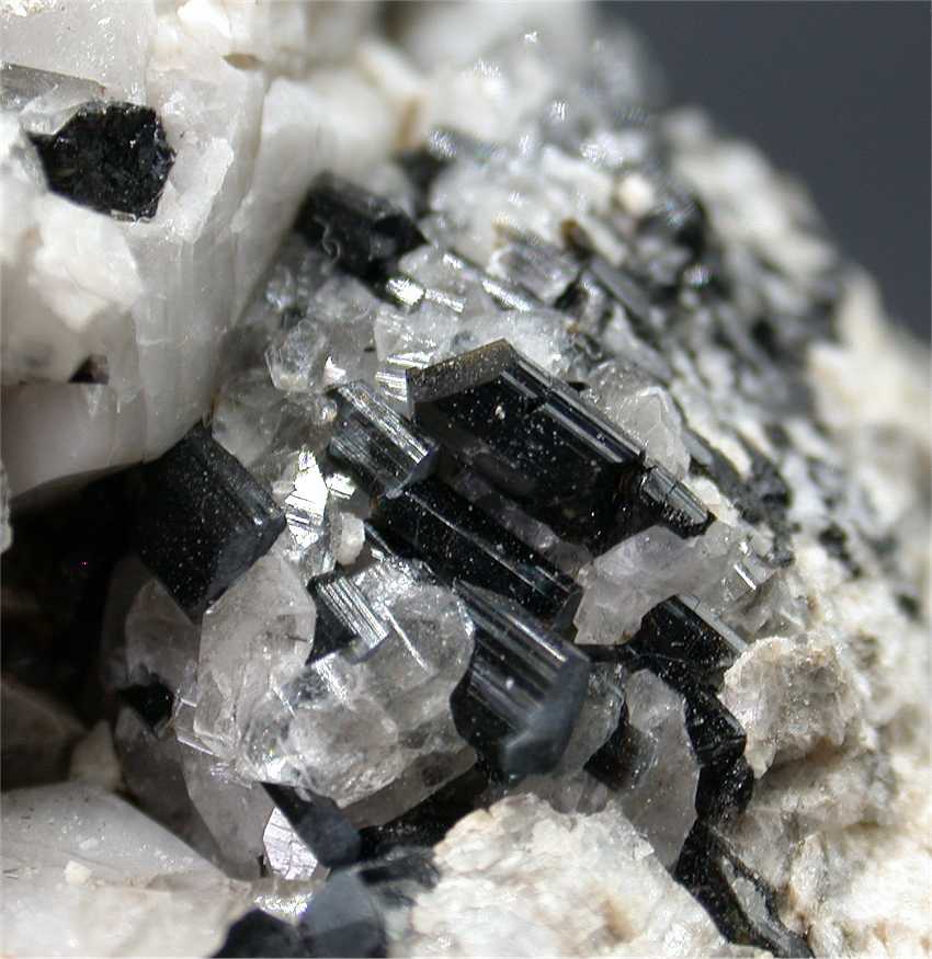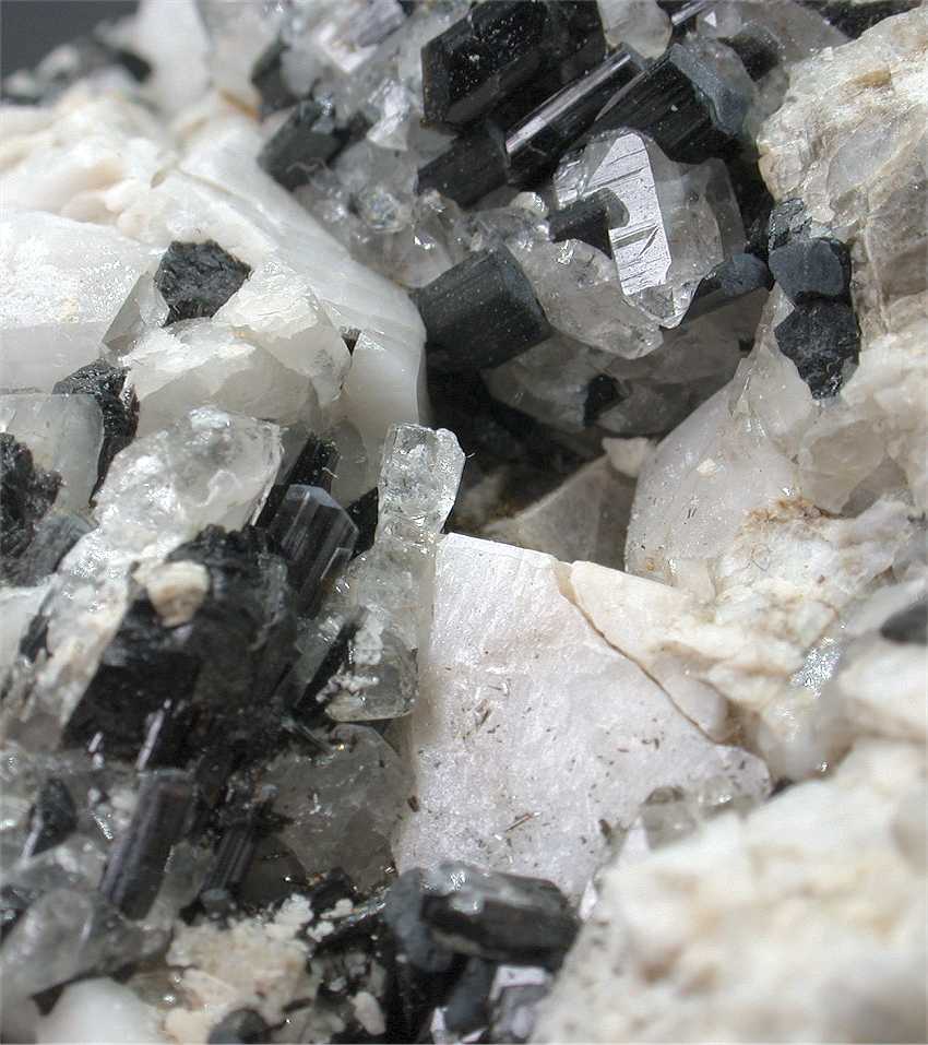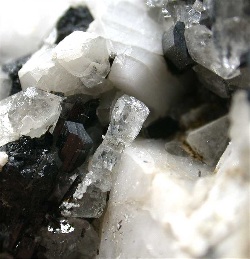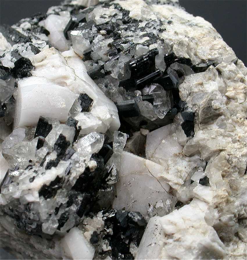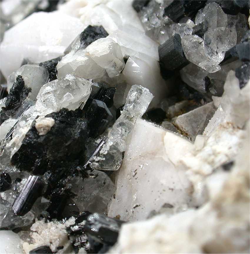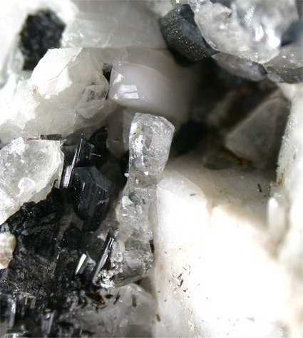 San Piero, Isola Elba, Livorno, Italy - This specimen shows an open pegmatite cavity with a lot of schorl crystals, many of them are terminated. The schorl are up to 0.5 cm. Classically, there are several orthoclases, bright white and on one of them there is a 0.9 cm beryl, terminated and waterclear. Beryls are usually coupled with schorl at Isola Elba. The orthoclases are 1 cm on the edge. Overall size is 8.5x7x5 cm.