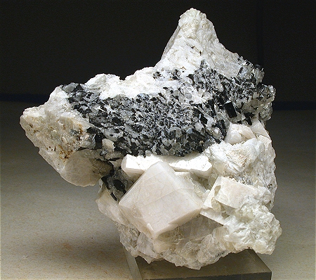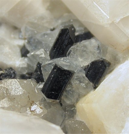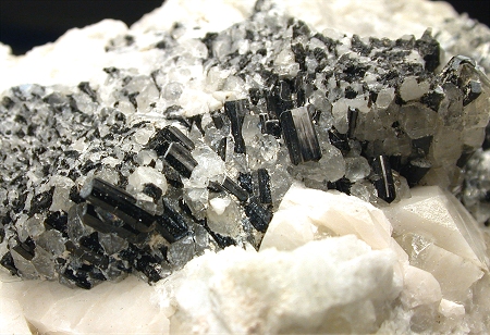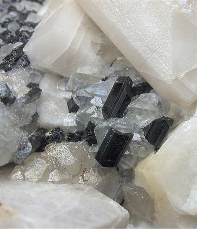 San Piero, Isola Elba, Livorno, Italy - Typical exmple of the structure of a crystallized vein inside the pockets of the pegmatite areas of Isola Elba. There is a 3 cm schorlite vein that shows various crystals throughout the specimen, nicely located close to quartz and feldspar crystals. The schorlite are up to 0.5 cm and some are biterminated. The feldspars are up to 2 cm on the edge ! overall size is 8x7.5x7 cm