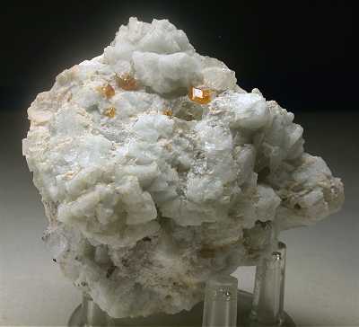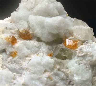 SAN PIERO, ISOLA ELBA, ITALY - The orange color of these spessartines are well visible on the white albite and feldspar matrix. The spessartines are up to 0.5 cm in size. Overall size is 5.5x5x4 cm.