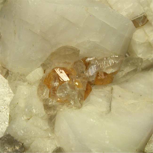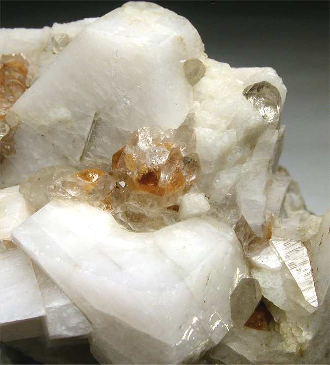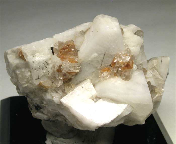 Grotta d'Oggi, San Piero, Isola Elba, Livorno, Italy - An old and very peculiar specimen since there are several 2-4 mm spessartines located on the faces of the feldspar crystals partly covered by waterclear quartz crystals. Nice specimen of 4.5x2.5x2.5 cm in size