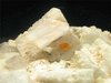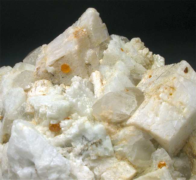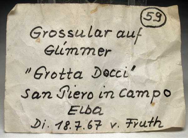 Grotta d'Oggi, San Piero, Isola Elba, Livorno, Italy - Though spessartine rapresent a classic for pegmatite areas, they have not been a frequent finding at isola Elba. Nevertheless this rock from Grotta d'Oggi shows several millimetric spessartines nicely located on the faces of the various orthoclase crystals ! the feldspars are up to 1.6 cm on the edge. The specimen has a 50 years old label that describes as "grossular" the spessartines and misspelled the name of the locality. Very peculiar old label ! Nice old timer of 5x4x3.5 cm