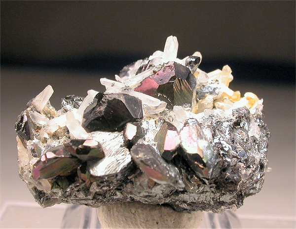 Bacino mine, Rio Marina, Isola Elba, Livorno, Italy - Nice bright and iridescent hematite crystals to 0.8-1 cm in size show among quartz crystals on an hematite matrix. A classic from Isola Elba iron…