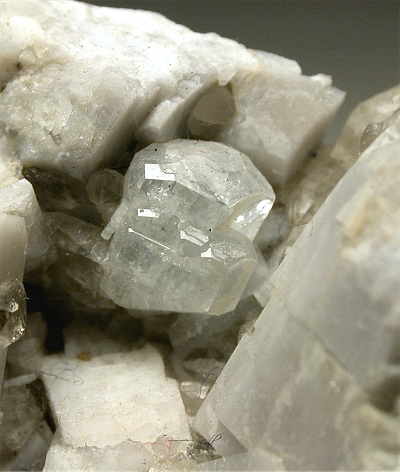 SAN PIERO, ISOLA ELBA, LIVORNO, ITALY - Colorless terminated beryl is nicely located on the white feldspar matrix. The crystal shows to be formaed by the combination of two crystals, compenetrated !…